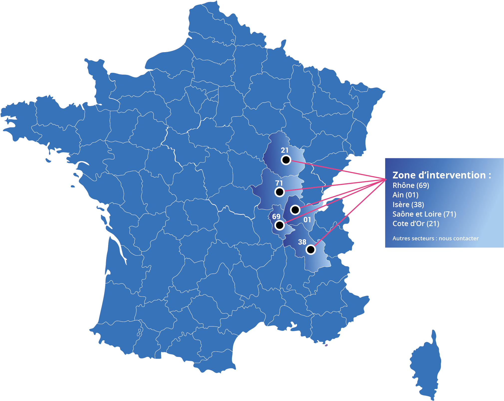 larges zones d'intervention géographique. Nos techniciens qualifiés sont prêts à répondre à vos besoins, dans toutes nos zones d'interventions.